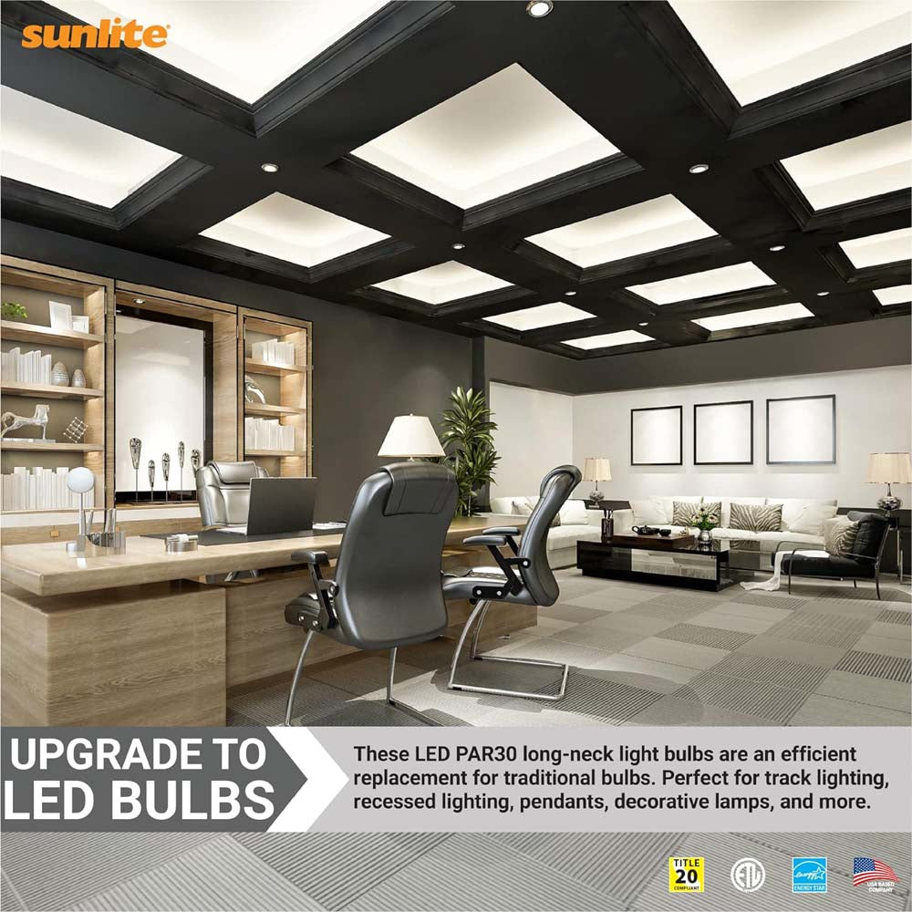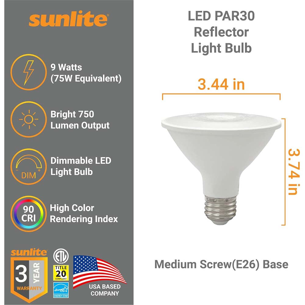 FEATURES:- UPGRADE TO LED - Replace incandescent and halogen PAR30 bulbs with energy efficient LED bulbs from Sunlite. These dimmable bulbs have a medium base (E26) and remain cooler to the touch even when lit.