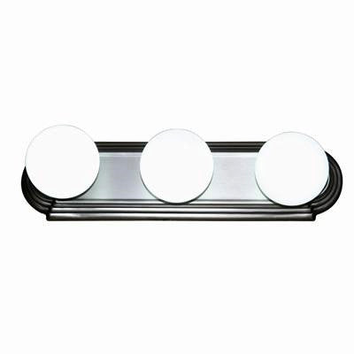 The simple design of this 3 light bath bar makes it completely versitle fitting neatly into many decors and spaces. Brushed Nickel finish, uses 60-W. Max globe bulbs. (M) Width 18", Height 5".-use three globe lampBulbs not included!