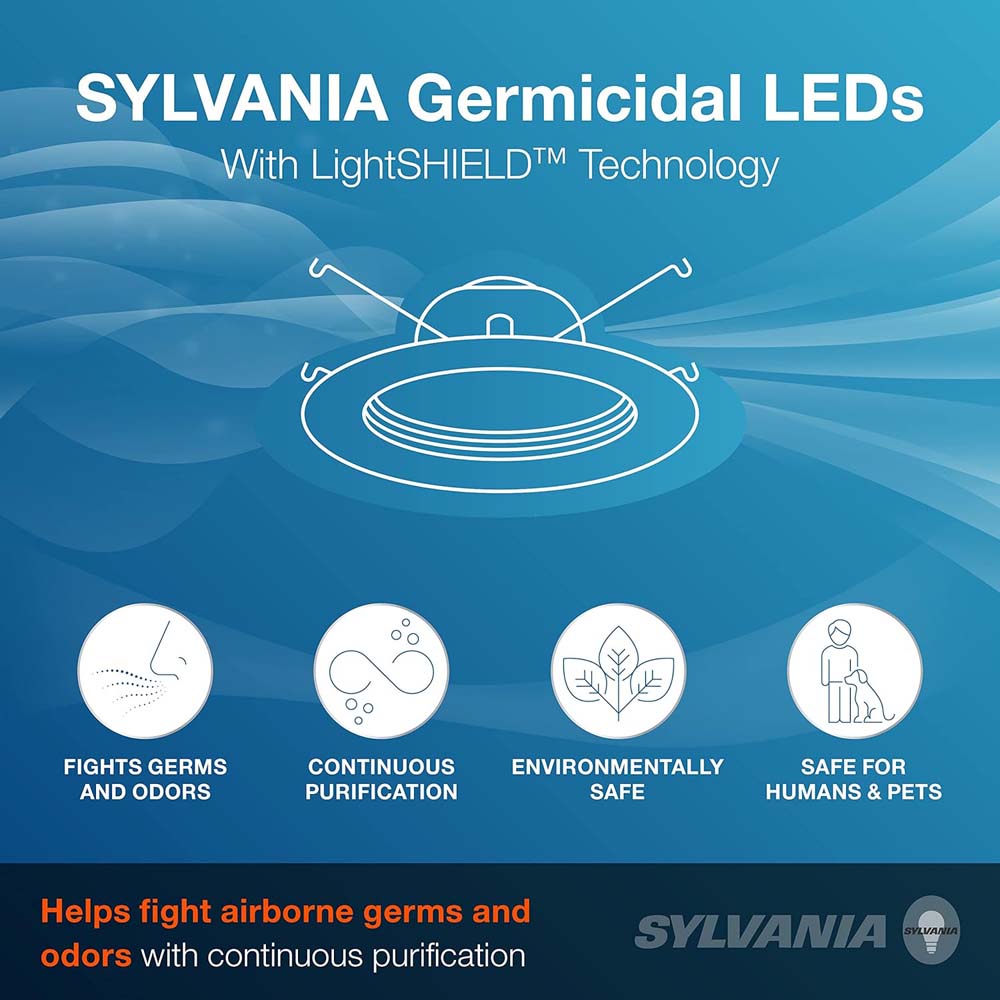 The SYLVANIA 5”/6” Recessed Downlight with LightSHIELD Technology is an everyday fixture with germ-fighting benefits. When the LED fixture is switched on the special coating is activated. The natural circulation of the air brings germs, odors, and any other organic compounds into contact with the coating, that then neutralize those substances. This luminaire is a direct replacement for traditional incandescent lamps and includes a E26 socket screw base for easy installation. It has a switch in the back to allow the choose between 5 different color temperatures (2700K / 3000K / 3500K / 4000K / 5000K). Environmentally friendly, these germicidal products are also safe for humans, pets, and plants. With a rated life of up to 50,000 hours backed by our standard 5-year warranty, see the clear difference 100 years of lighting innovation makes with SYLVANIA. As a global leader and full-spectrum provider of professional, state-of-the-art, lighting solutions, SYLVANIA products focus on catering to the changing needs of our customers and environment.
