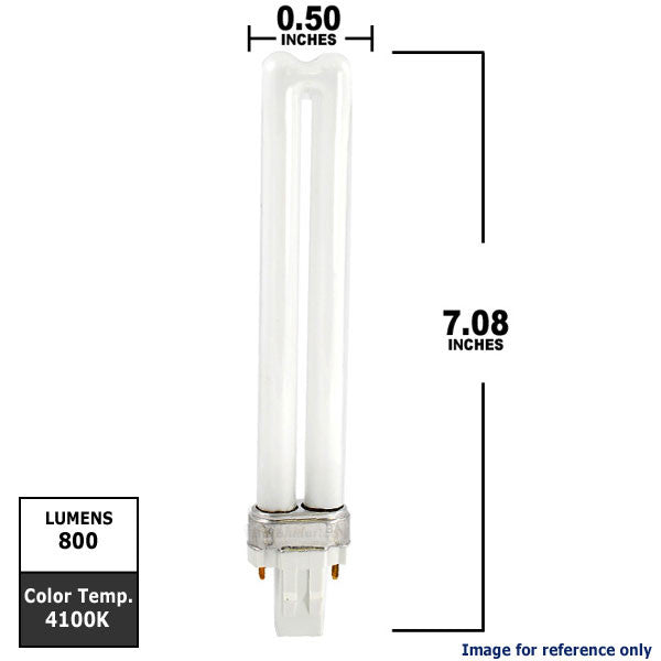 This 13 watt fluorescent bulb, has a lumens of 800 and a single tube 2-pin shape. It has an abbreviation name of CF13S/841, a base of GX23 and a color rendering index of 85. This fluorescent bulb has a color temperature of 4100k, a diameter of 0.50 inches and a rated life of 10,000 hours.