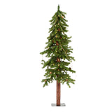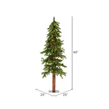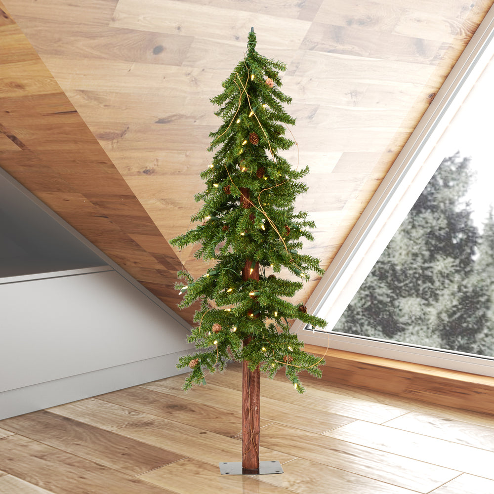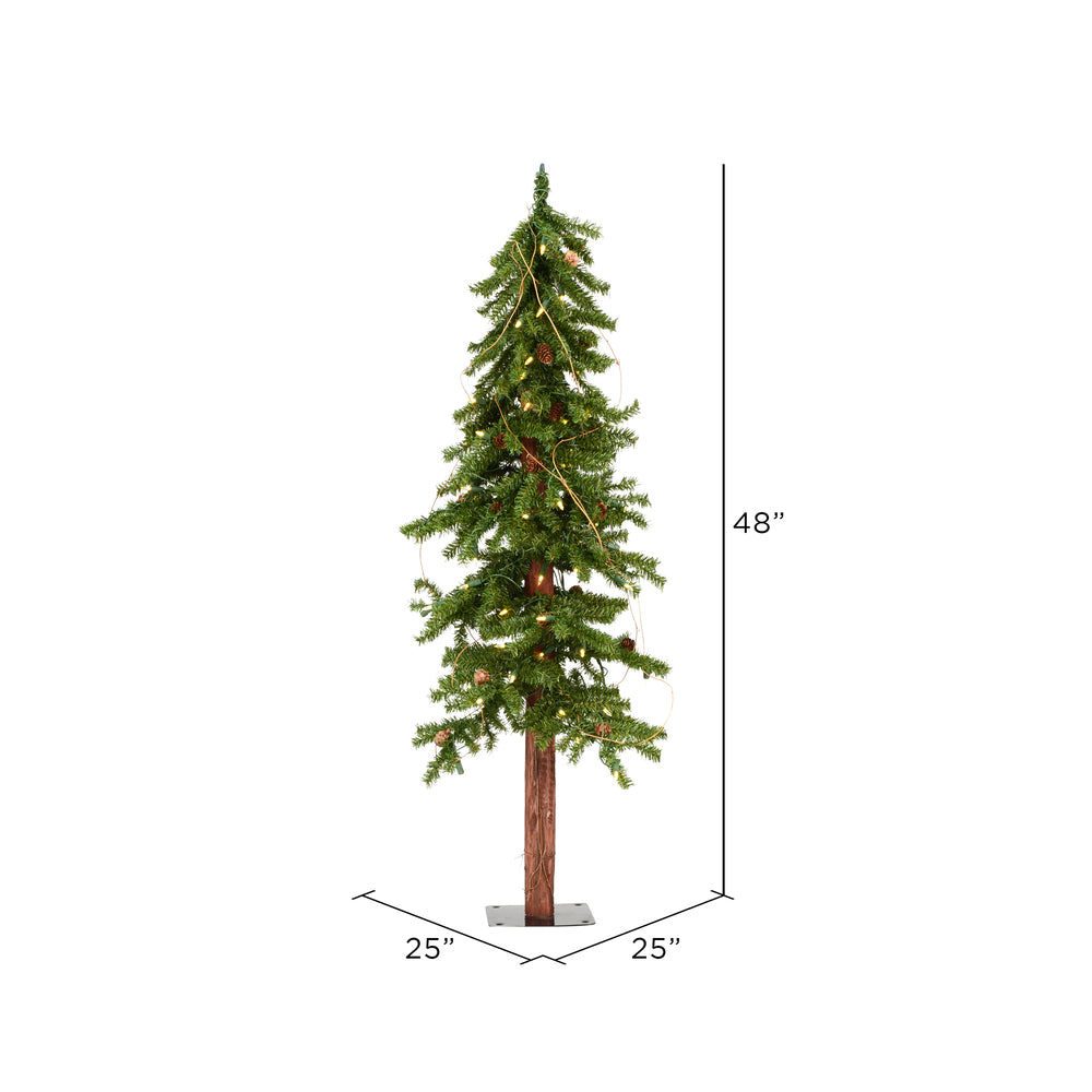 Vickerman 4F Alpine Artificial Christmas Tree featuring 351 PVC Tips and 100 Warm White Dura-Lit LED Lights. This beautiful Alpine comes prelit with energy efficient Warm White Dura-lit LED Mini Lights and can be incorporated into any holiday or everyday rustic decor. It features traditional deep green PVC tips with pine cone and grapevine accents on a real wood trunk, a flat metal tree stand is included.