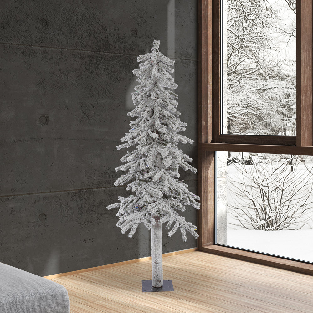 Vickerman Artificial 5F x 28-in Flocked Alpine Christmas Tree with 348 PVC Tips. This tree comes unlit and has medium weight white flocking on green tips, a real wood trunk and a flat metal base is included.