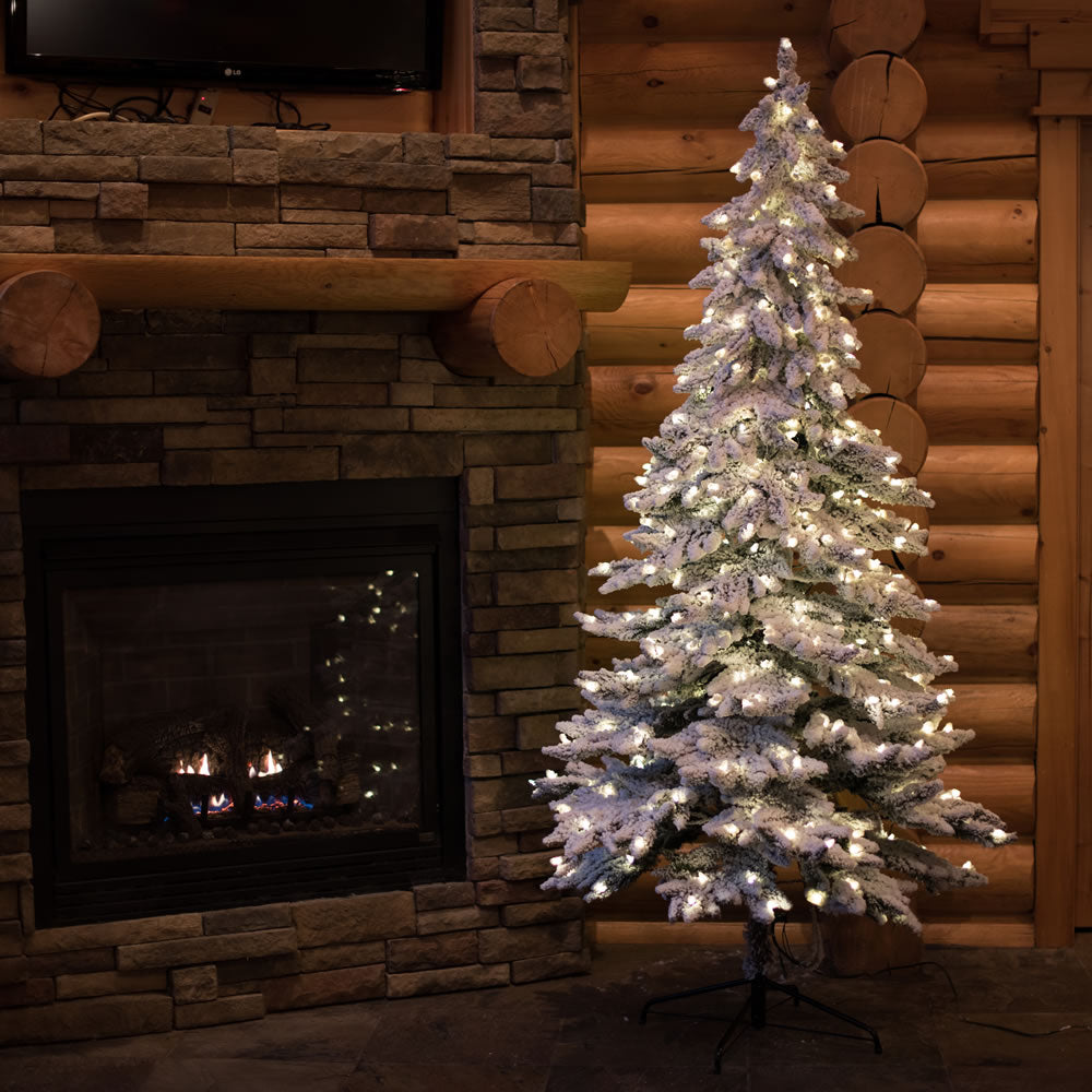 Vickerman Artificial 6F x 33-in Flocked Spruce Alpine Christmas tree featuring 722 tips and 300 clear lights. This tree has beautifully flocked tips on metal hinged branches and a Metal tree stand is included. It has dura-lit lights which means when one or more bulbs do not function, the rest of the strand will stay lit.