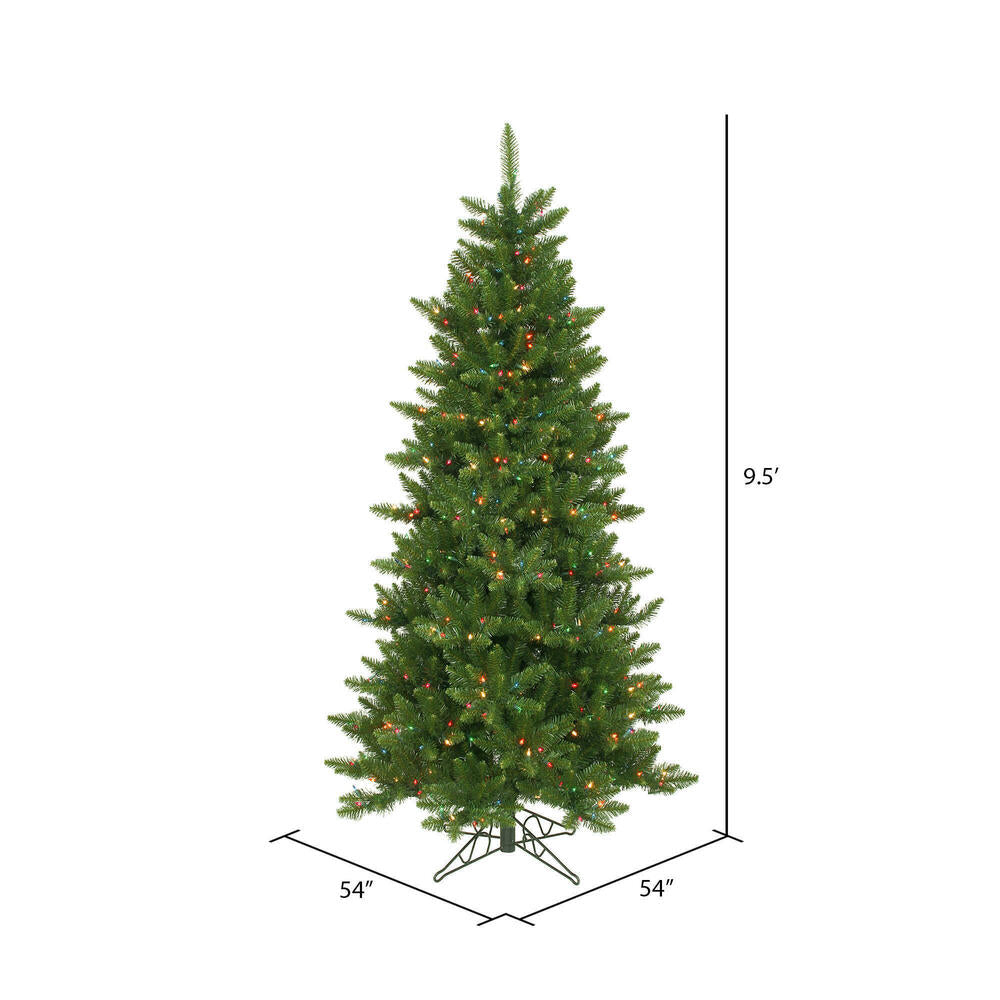 Vickerman 9.5F x 54-in Camdon Fir Artificial Christmas Tree featuirng 2350 PVC Tips and 1000 Multi-colored Italian Dura-lit LED Lights. This beautiful Camdon Fir tree comes prelit with Multi-colored Italian Dura-lit LED Lights, has rich green PVC tips on metal hinged branches, a Convenient On/Off Step Switch, and a Folding Metal Tree Stand is Included.