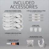 - Includes 3 end caps, 3 splice connectors, 4 power cords, 9 splice pins, mounting clips, sealant - enough power cords and accessories for four complete independent light runs